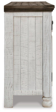 Have your fill of modern farmhouse style with this TV stand. Its distressed two-tone finish pairs a vintage white with a weathered gray for a look that’s utterly charming. Right and left cabinets open to reveal adjustable shelving for all your entertainment center storage needs. Center glass doors add to its relaxed appeal.