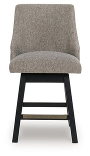 Casual contemporary design. Made with hardwood solids, Mango wood veneer, and MDF substrate. Finished in a modern, trend-right dark gray brown wood tone. The clean lined contemporary styled D618-35 dining table features a thick top silhouette with a self storing butterfly leaf. D618-13 counterheight table features clean lined contemporary styling with a thick top silhouette. Chairs feature a modern styled design with decorative fabric loops capturing the mid back rail and a convenient cut-through hand grab at the top rail. Chairs feature light gray Next-Gen Nuvella™ performance fabric for worry free cleanability. All chairs in this collection have adjustable levelers.