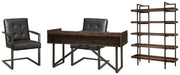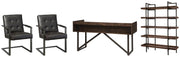 For fans of urban industrial design, this home office set steals the show. The desk and bookcase are crafted with a mix of acacia veneer and wood beautified with an oiled walnut-tone finish. Sleek metal frames and linear accents on the pieces work so well together. The chairs' tufted seats, wrapped in a “weathered” faux leather upholstery, are loaded with retro-chic flair. Gallery-style elements on the pieces stack up to great form and function.